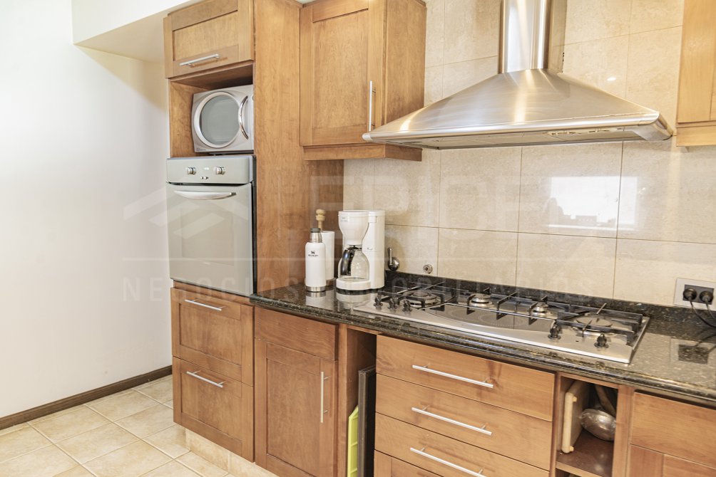 Cocina con muebles bajo mesada, alacenas y barra desayunadora.