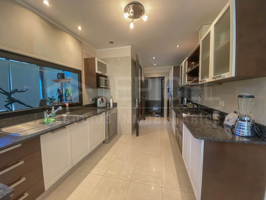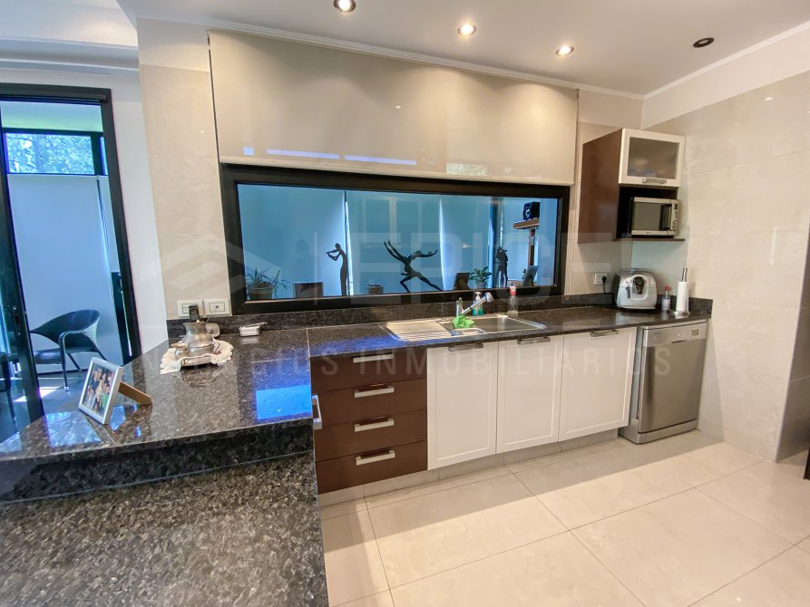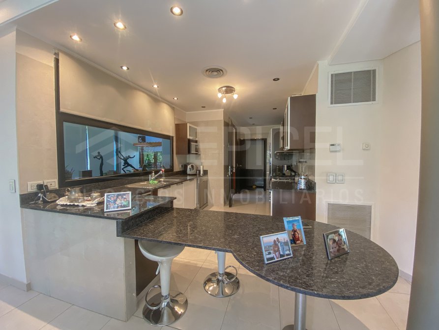 Cocina equipada con barra desayunadora, mesada de mármol granito negro, muebles bajo mesada y alacenas.