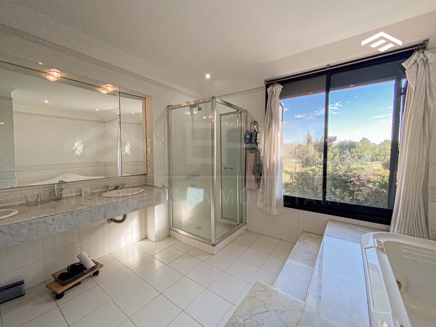 Baño completo que incluye jacuzzi, box de ducha, doble vanitory, inodoro y bidet.