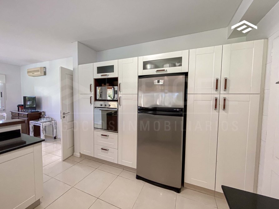 Cocina con muebles bajo mesada y alacenas, anafe y horno marca Ariston, conexión con el comedor formal.