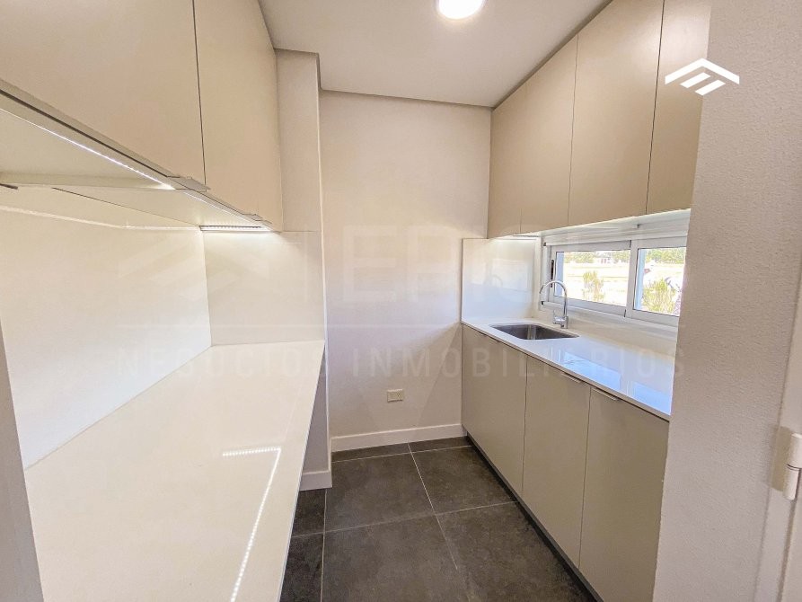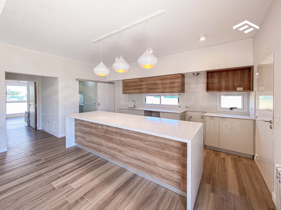 • Cocina con isla, mesadas de Silestone, muebles de melamina combinados, bacha Johnson y griferías FV. Salida directa a la galería