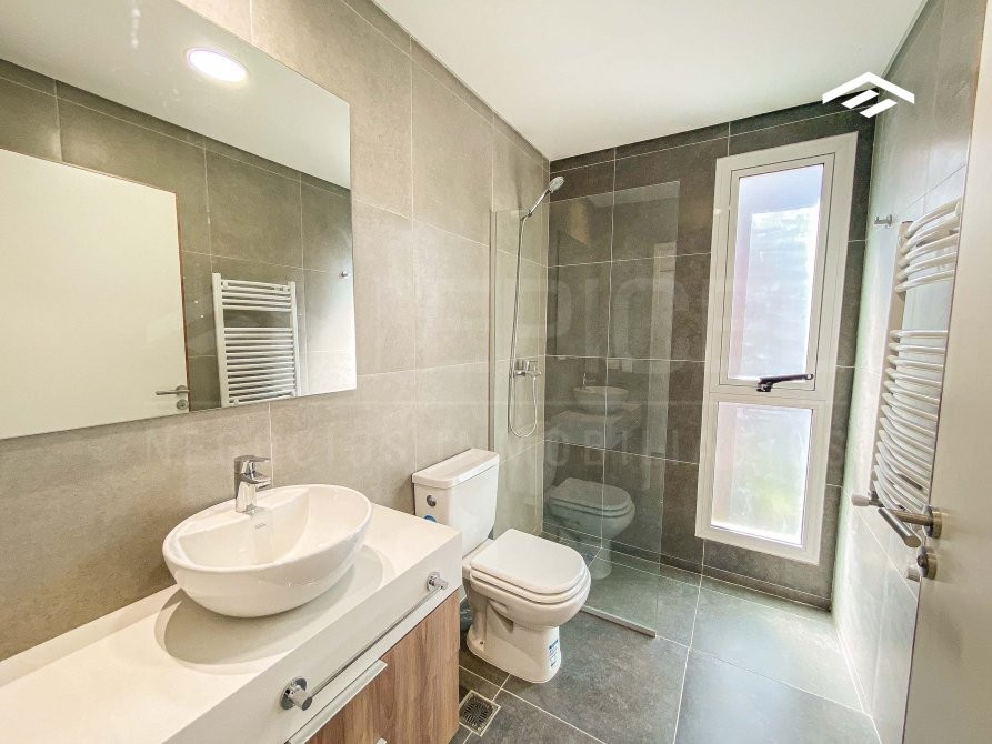 • Toilette de recepción, con amplio vanitory, mesada de Silestone, bacha Ferrum y espejo