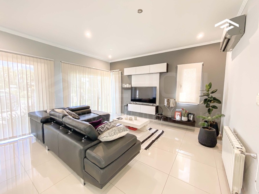 Living con splits frío-calor, pisos de porcelanato y techos con molduras