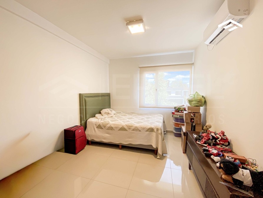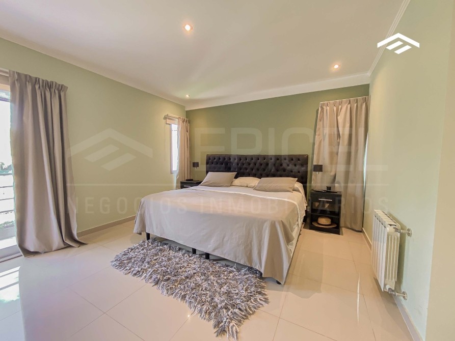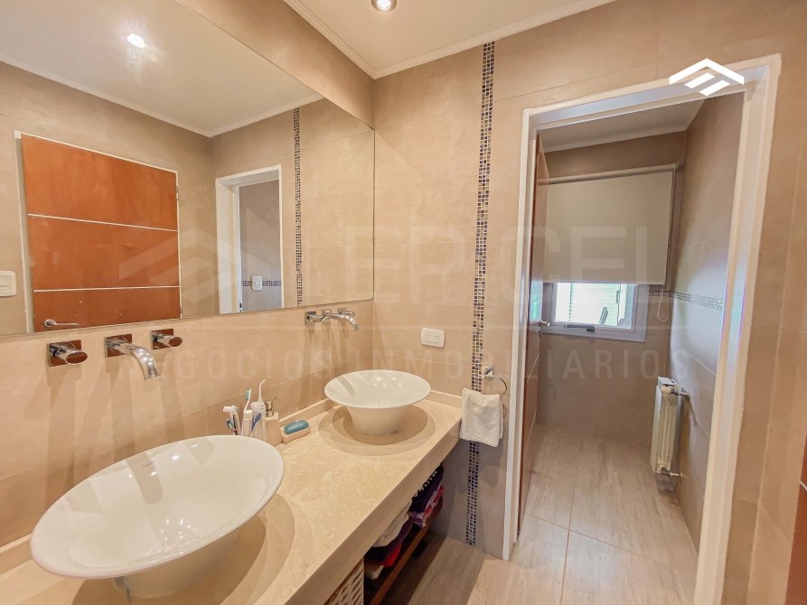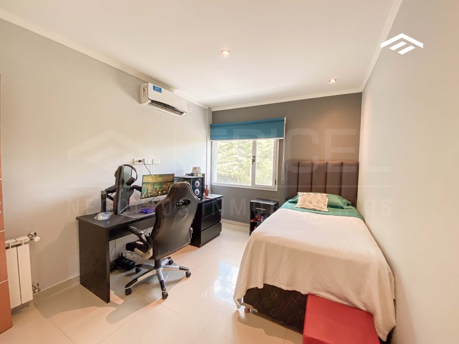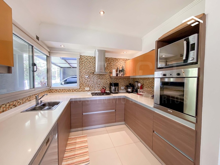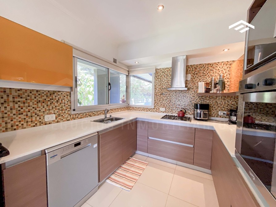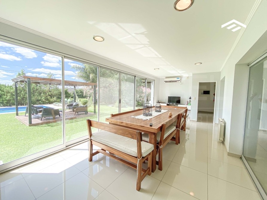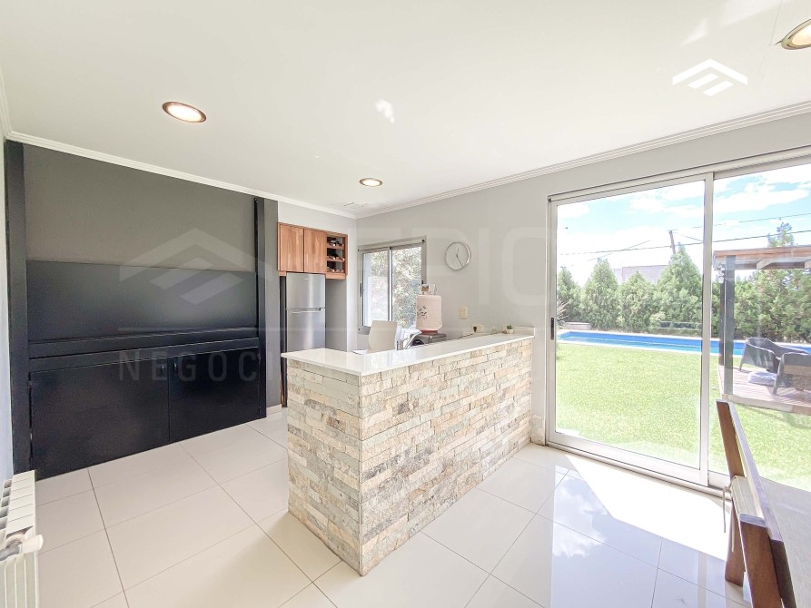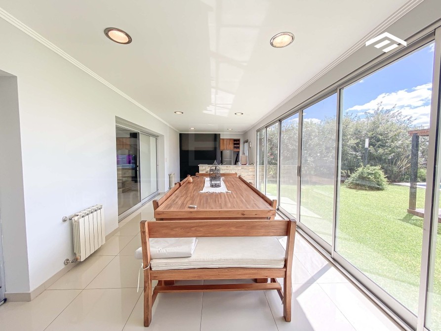 Quincho cerrado con parrilla amplia, mesada de silestone con bacha y bajo mesada, espacio para heladera, mesa para 12 comensales, calefacción por radiadores y splits frío-calor