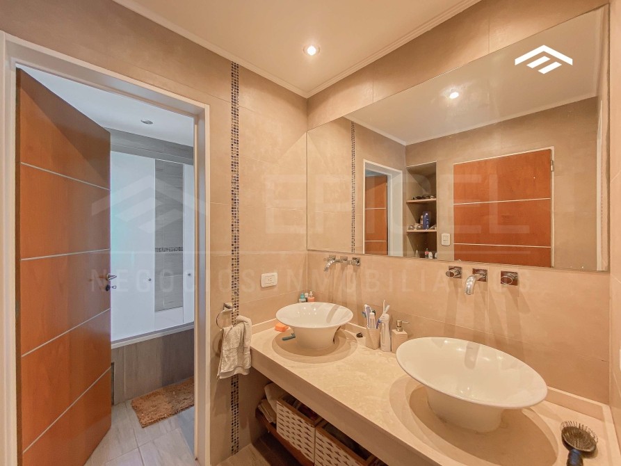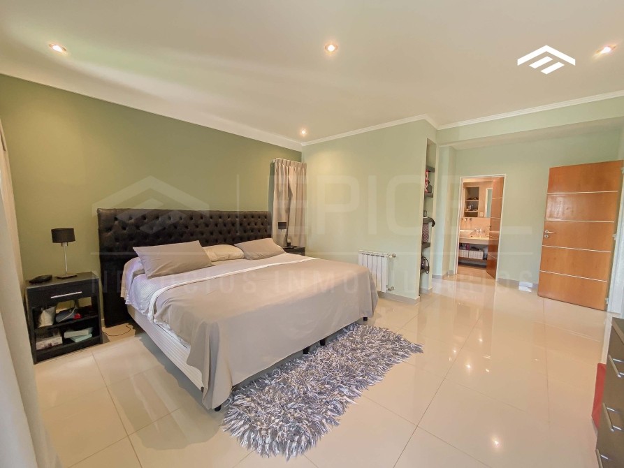 Dormitorio principal en suite con vestidores enfrentados y baño tripartito con antebaño con doble bacha, bañera con hidromasaje, inodoro y bidet
