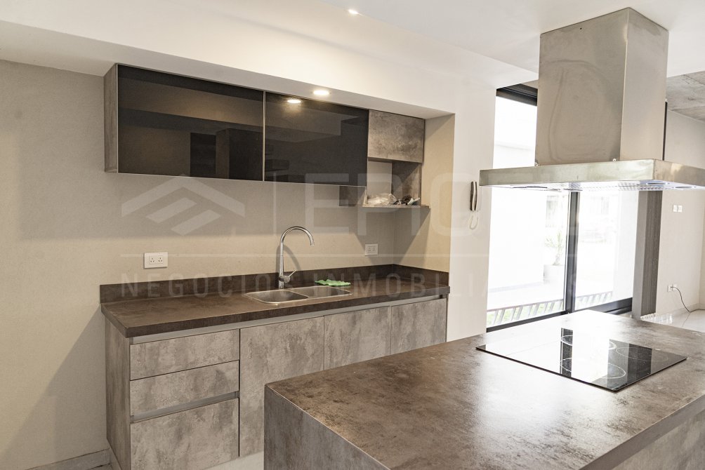Cocina con isla, muebles bajo mesada y alacenas, mesada de granito y doble bacha.