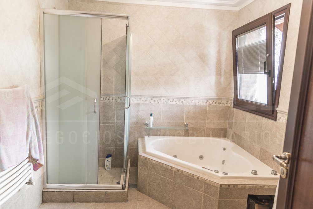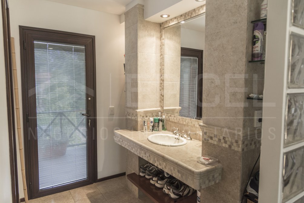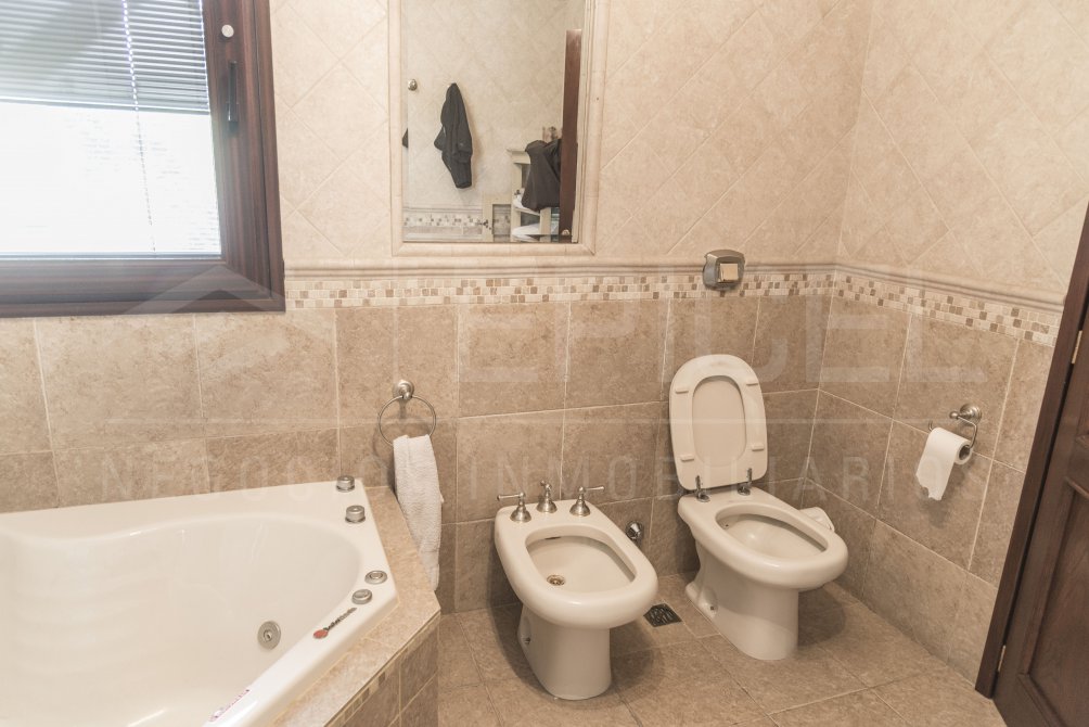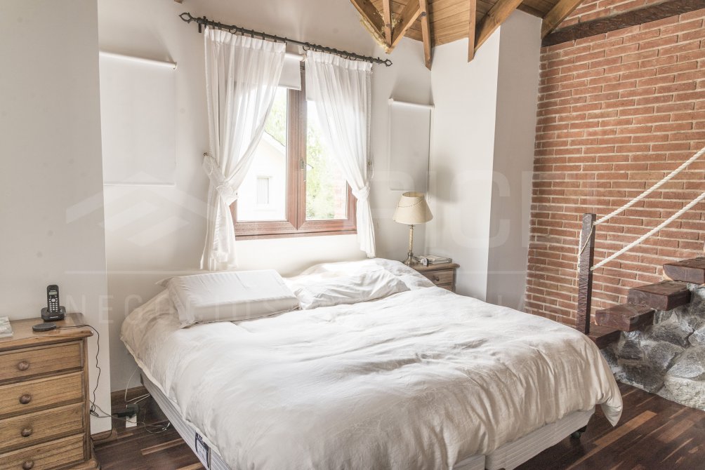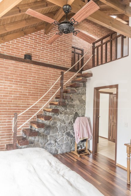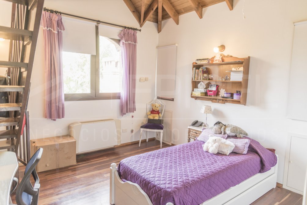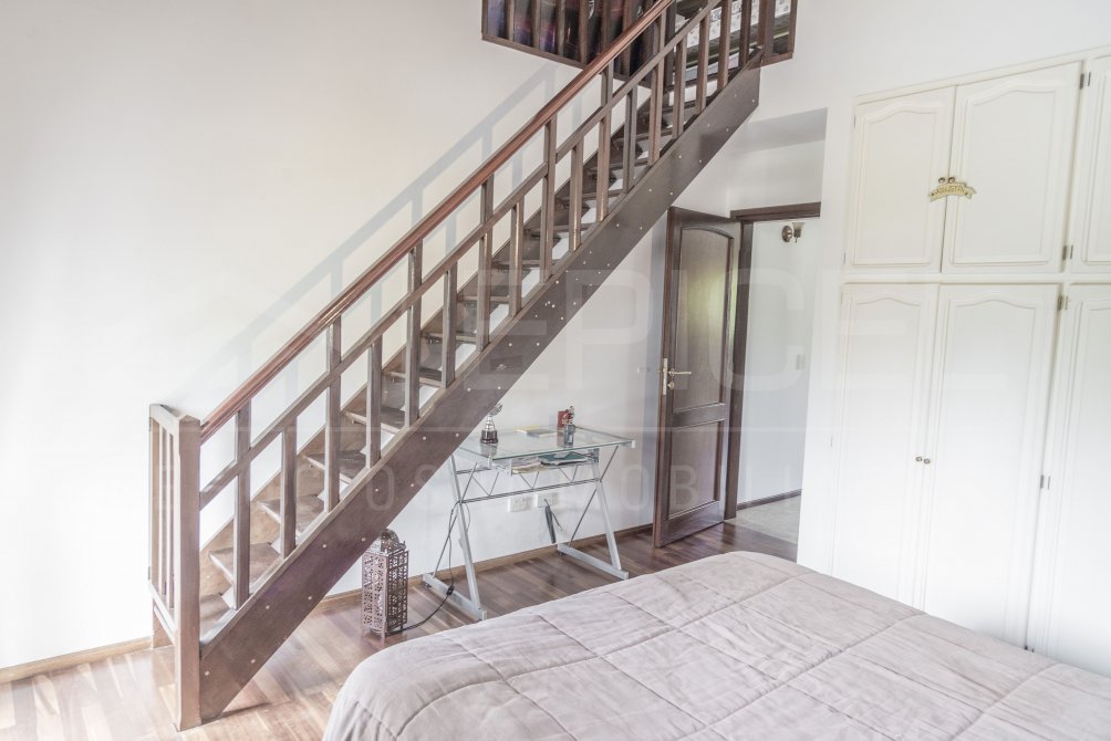 Habitación principal en suite (ante baño y baño completo con hidromasaje y box de ducha) con vestidor, balcón y acceso por escalera a tercer nivel con dimensiones para un escritorio.