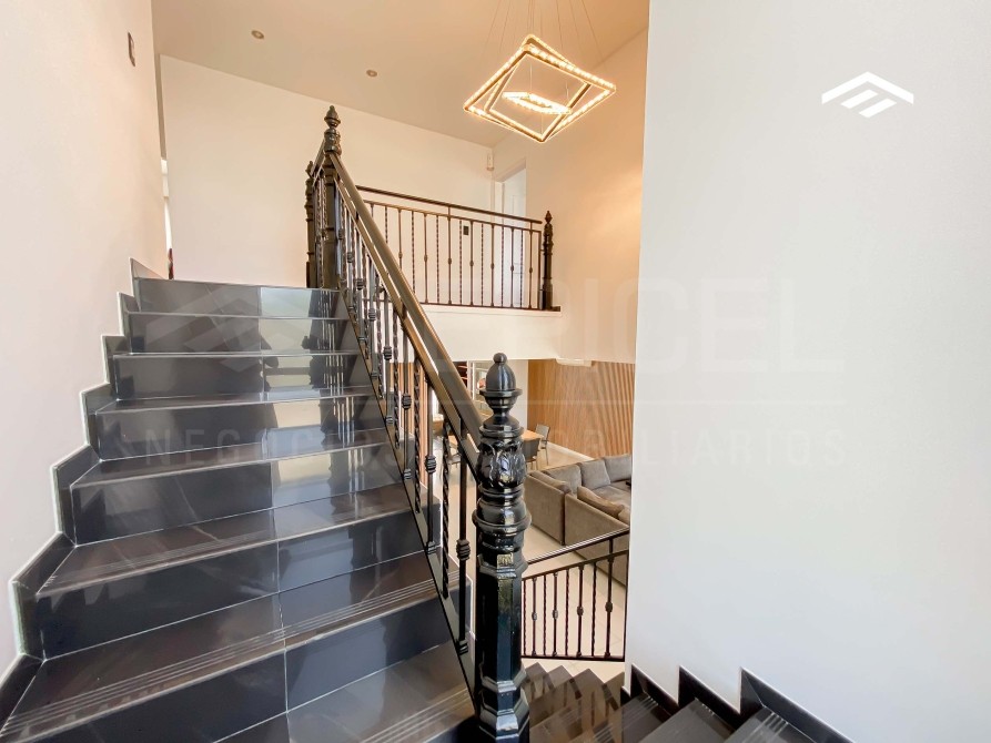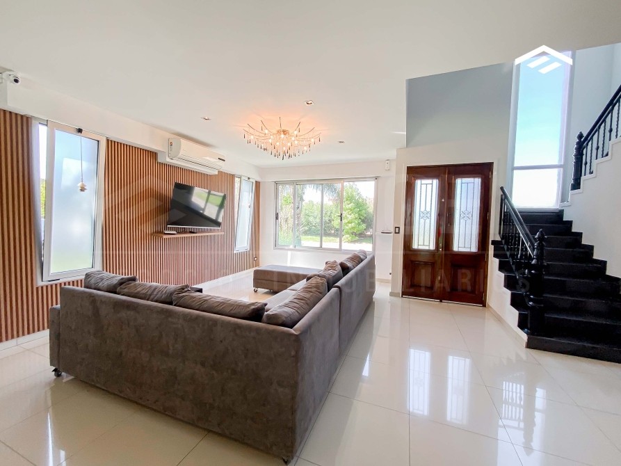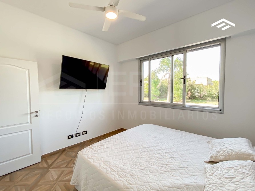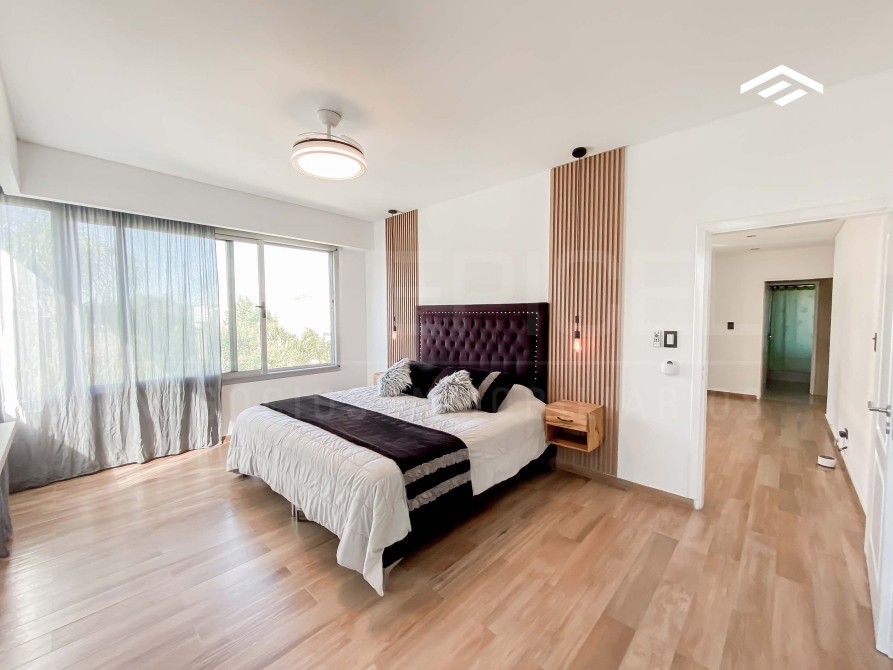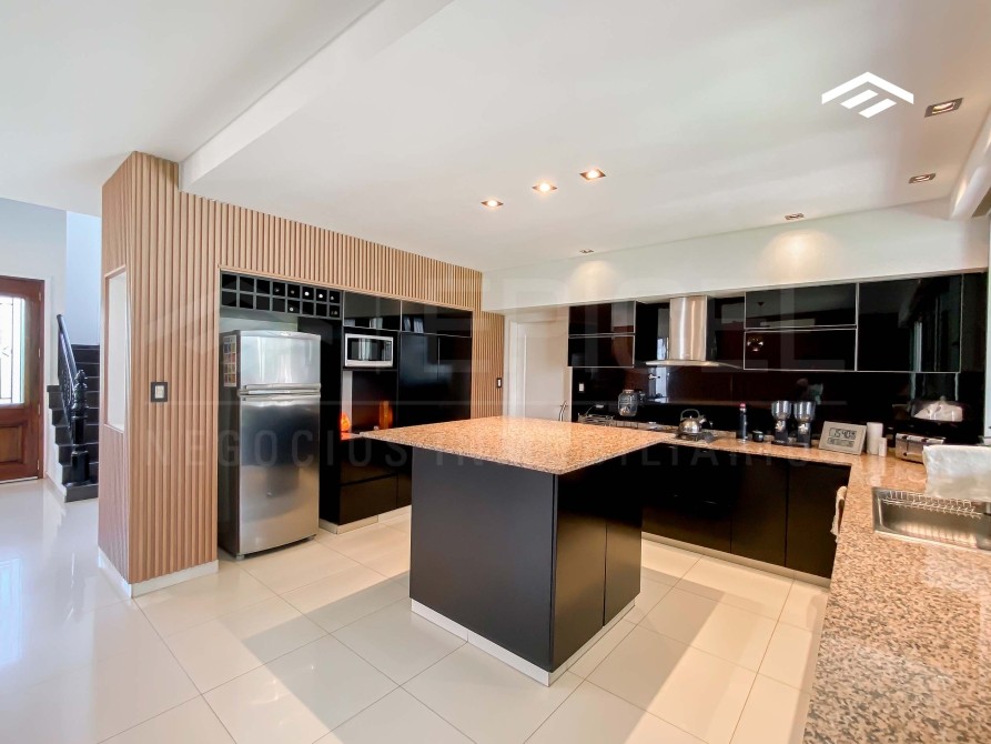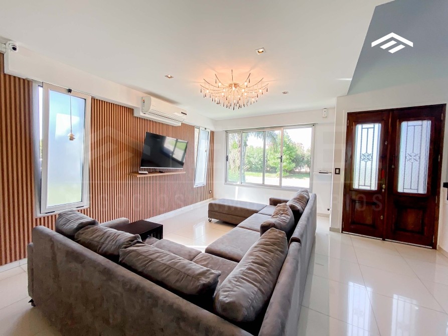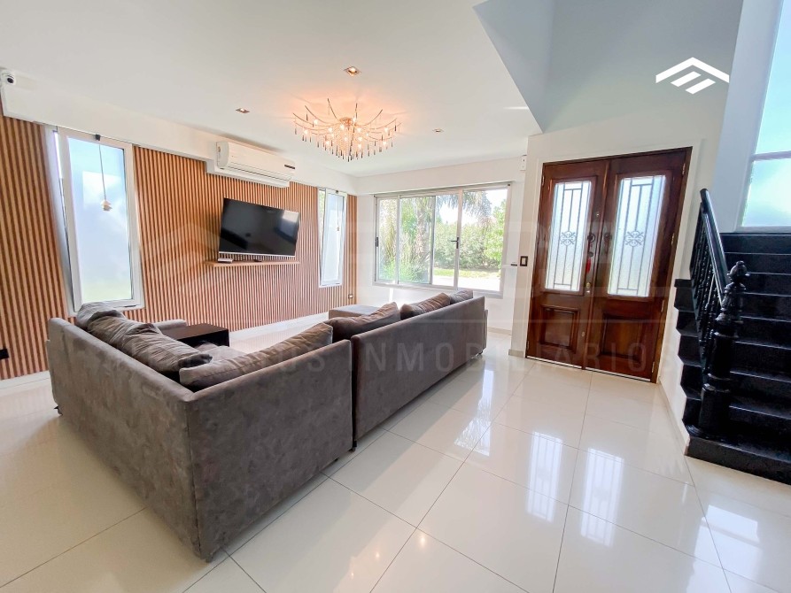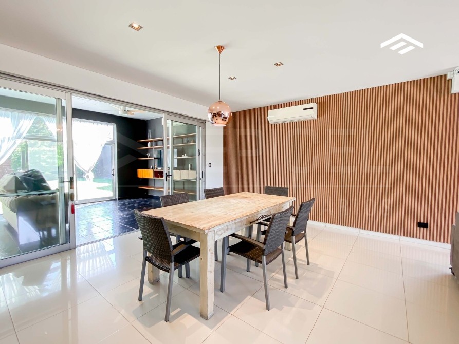 Casa de estilo moderno de 320 m2 totales desarrollada en dos plantas, con ambientes amplios y luminosos, se encuentra realizada sobre un lote de 724 m2 ubicado proximo al ingreso del barrio. La casa cuenta con un escritorio en planta baja, quincho cerrado con parrilla, y piscina.