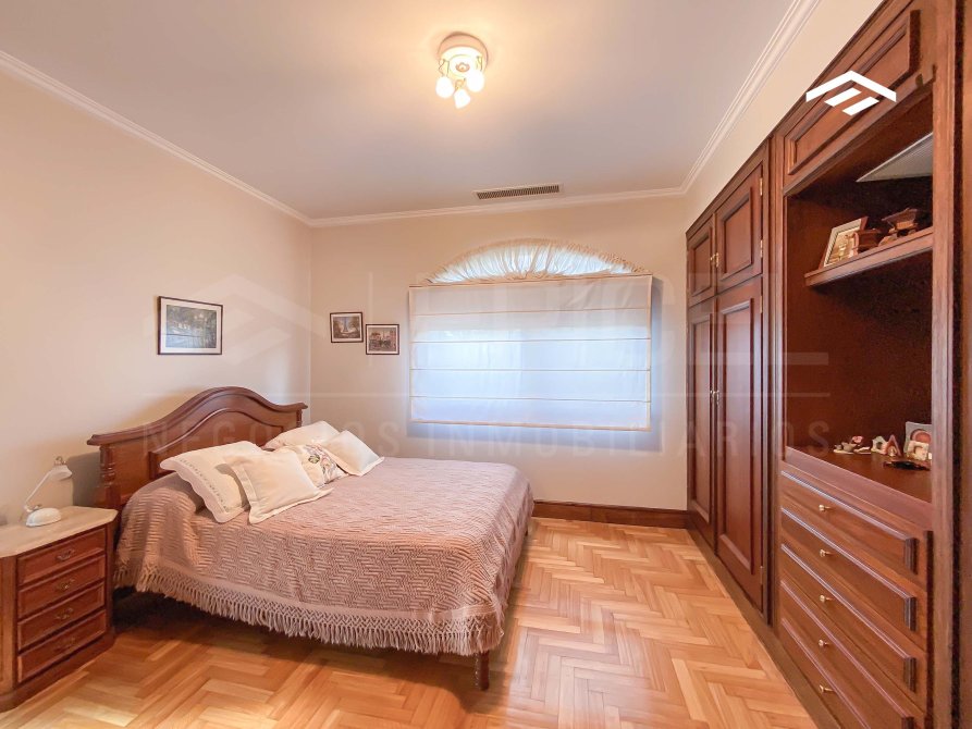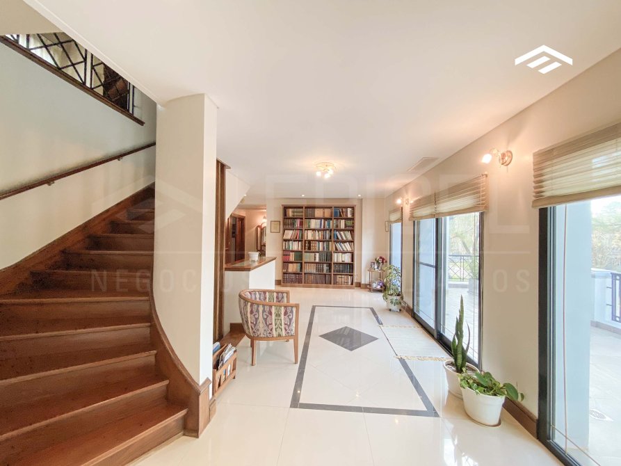 pisos de madera en la planta alta que aportan calidez a los espacios privados. La escalera principal es de madera maciza y los techos presentan molduras decorativas que realzan la elegancia de cada ambiente. Además, posee riego por
