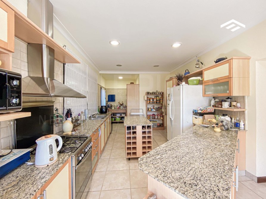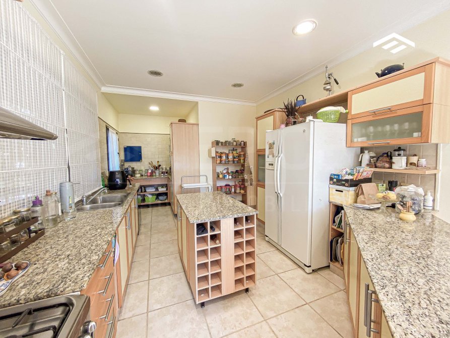 - Cocina de doble circulación, equipada con muebles Johnson de alta calidad (bajo mesada, alacena e isla central) y mesadas de mármol; incluye ingreso independiente desde el exterior.