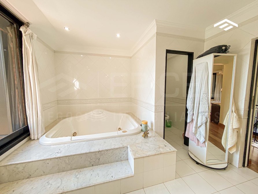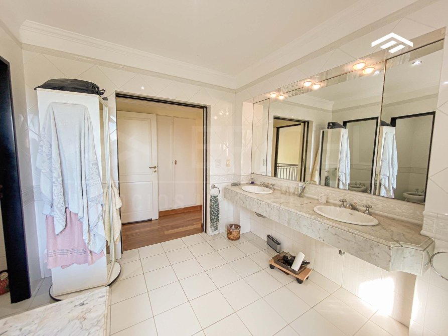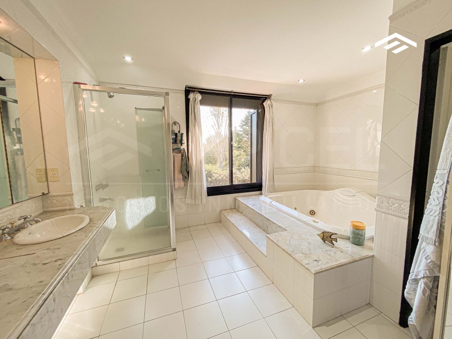 Baño completo que incluye jacuzzi, box de ducha, doble vanitory, inodoro y bidet.