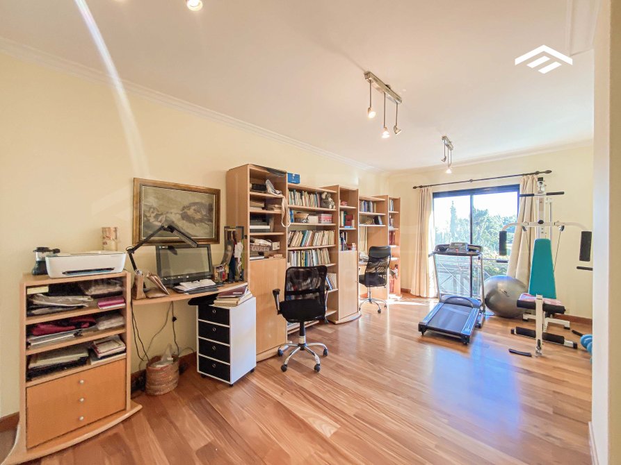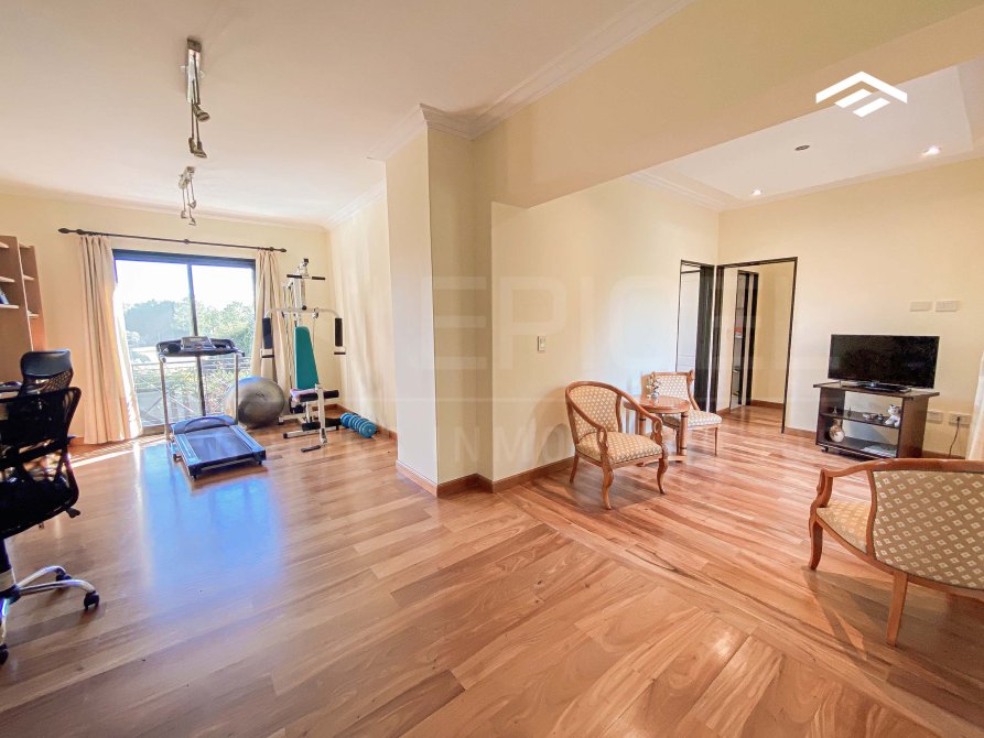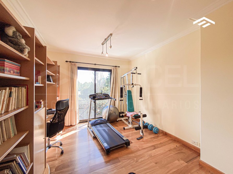 - Playroom o gimnasio, ambiente amplio, abierto, con placard de blancos y vista tanto al frente como al jardín.